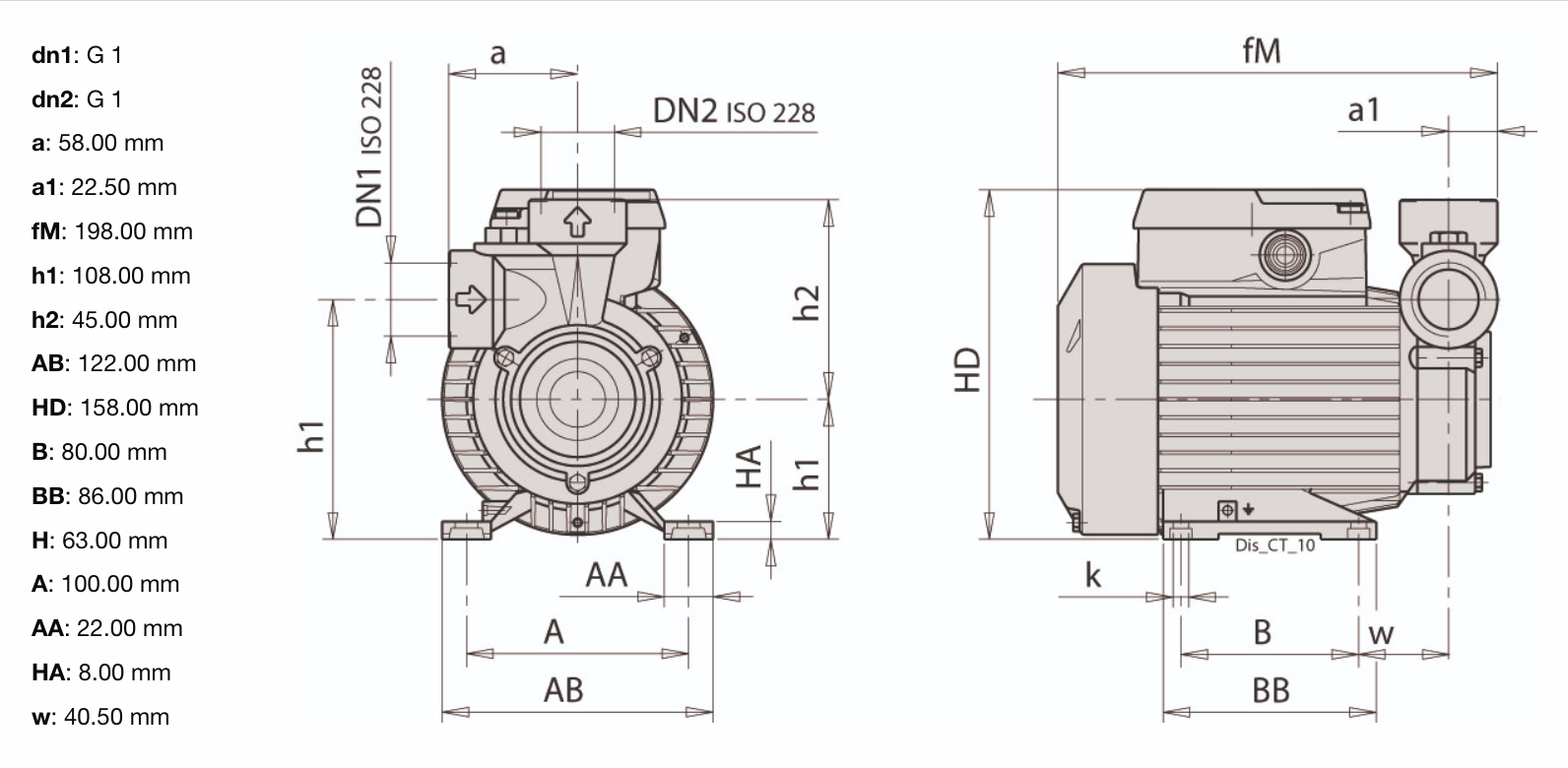 Dimensão (mm): a - 58 | a1 - 22,50 | fM - 198 | h1 - 108 | h2 - 45 | AB - 122 | HD - 158 | B - 80 | BB - 86 | H - 63 | A - 100 | AA - 22 | HA - 8 | w - 40,50
