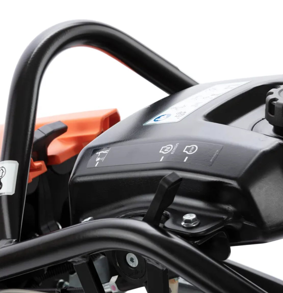 O acelerador de três posições (ralenti, rotação máxima, parado/fechado) fecha também a linha de combustível para evitar fugas. O design equilibrado proporciona uma excelente tração e capacidade de manobra.